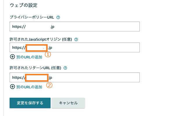 「JavaScriptオリジン」「リターンURL」には、サブスクストアでご利用いただくカートドメインを「https://」を含めてご入力いただき、内容を保存してください。