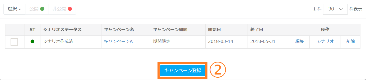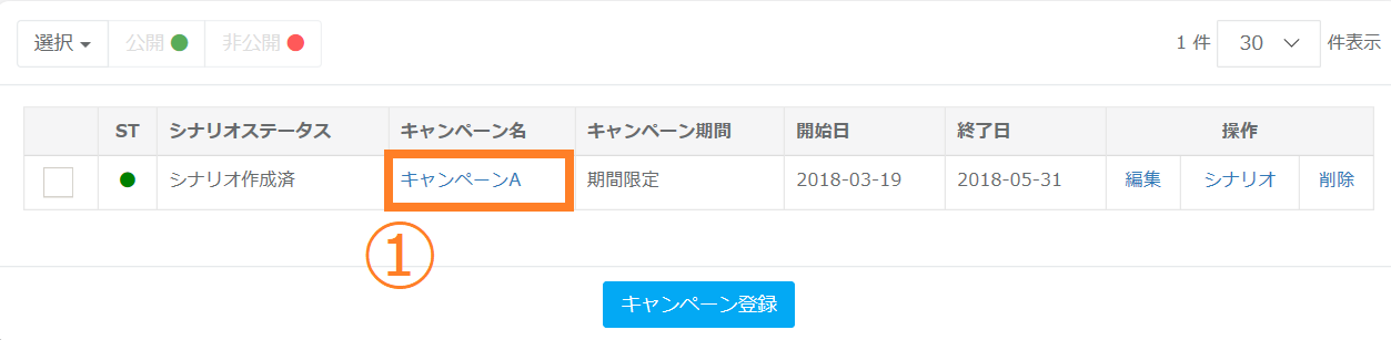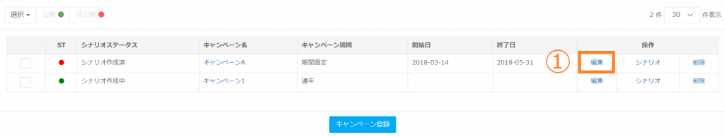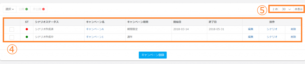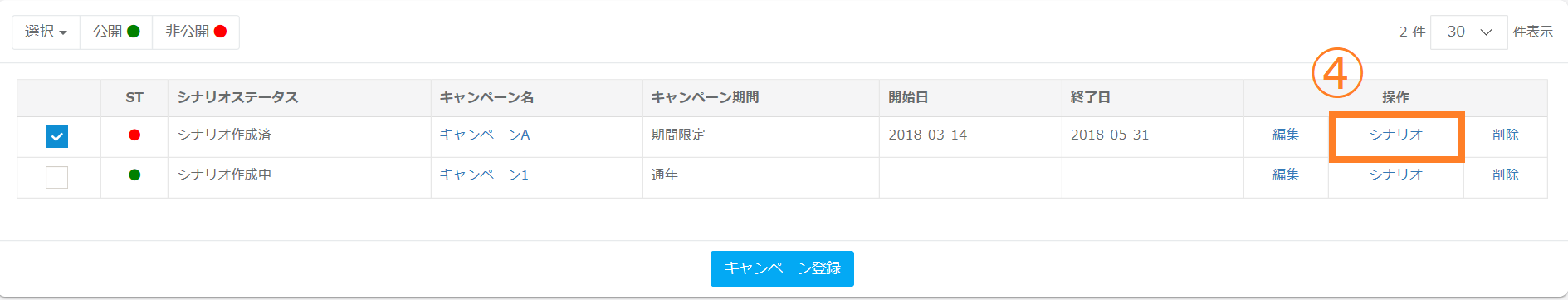 ④各キャンペーンごとに「シナリオ」ボタンがありますので、クリックしてください。シナリオの設定画面が開きますため、そちらで編集を進めてください。