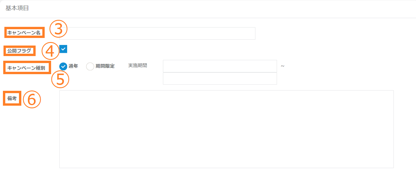 ⑥備考には管理者様用に作成するキャンペーンの詳細や注意事項をご記入いただけます。