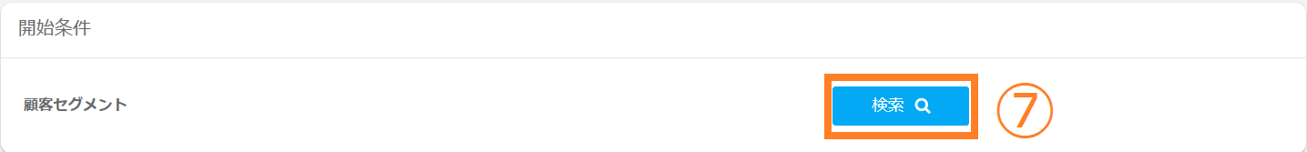 ⑦続いてキャンペーンが実施される開始条件を設定します。「検索」ボタンをクリックし、事前に作成いただいたセグメントを登録します。