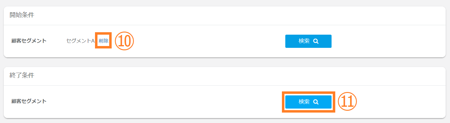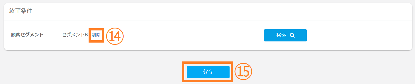 ⑪キャンペーンの終了条件を設定します。「検索」ボタンをクリックし、事前に作成いただいたセグメントを登録します。
