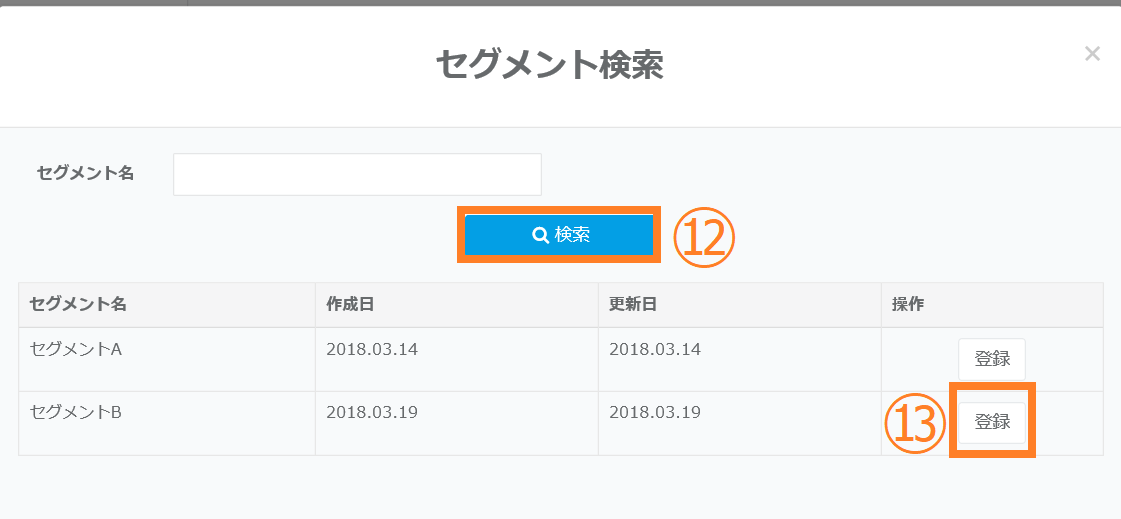 ⑫登録するセグメント名を入力し、「検索」ボタンをクリックします。