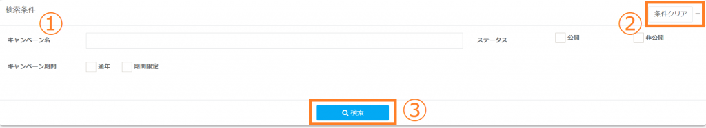 | キャンペーン名 | 対象のキャンペーン名を指定してください。 ※部分一致での検索が可能です。 |