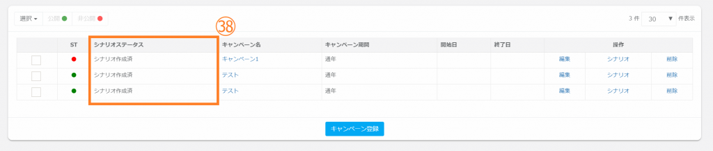 ㊳シナリオの書き出しを行ったキャンペーンはシナリオステータスが「シナリオ作成済み」となります。書き出しを行っていないキャンペーンは「シナリオ作成中」というステータスになるため、別途書き出しを行っていただく必要がございます。