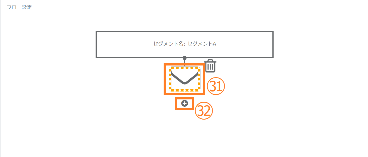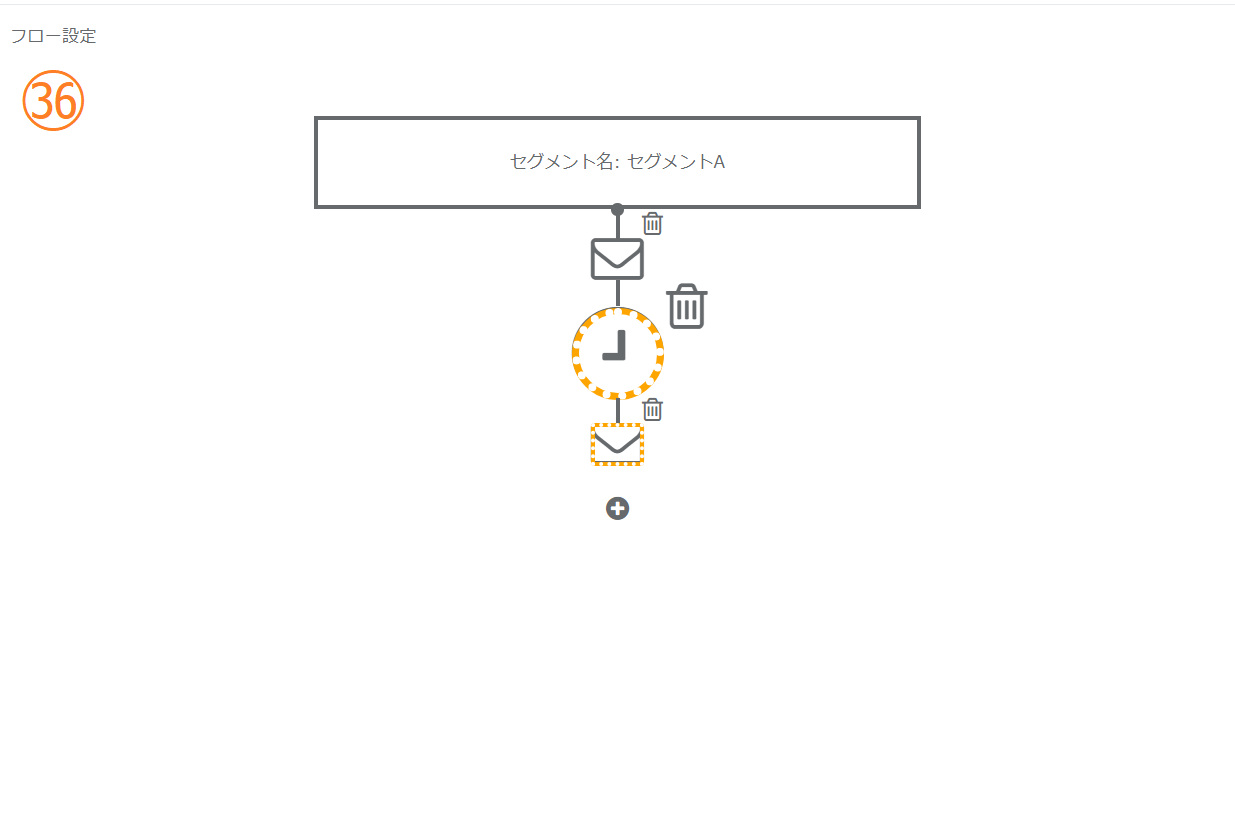 ㉝再び時計のマークとメールのマークが表示されます。今回はメールの配信タイミングの間を空けるため、待ち時間設定を行います。時計のマークを選択後、マークがオレンジの枠で囲まれるため、再度クリックします。