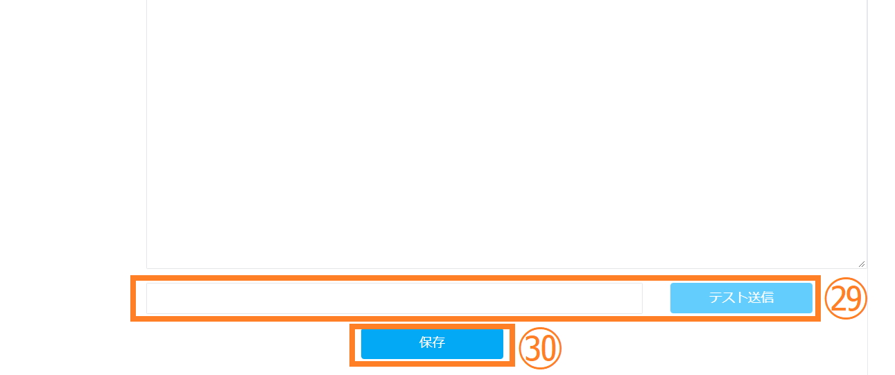 ㉙メール設定が完了したら、確認の為任意でテストメールの送信が可能です。テストメールを送信するメールアドレスを入力し「テスト送信」ボタンをクリックします。