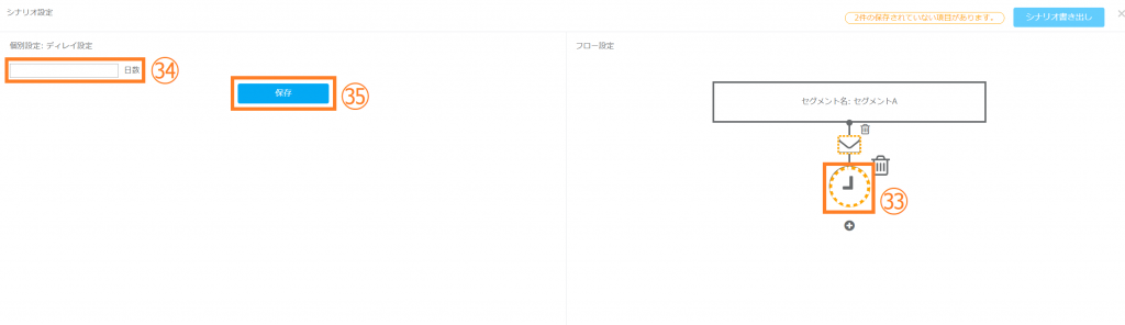 ㉞次のメールを「●日後に配信する」といった、配信までの日数の設定を行います。入力欄に任意の日数を入力します。