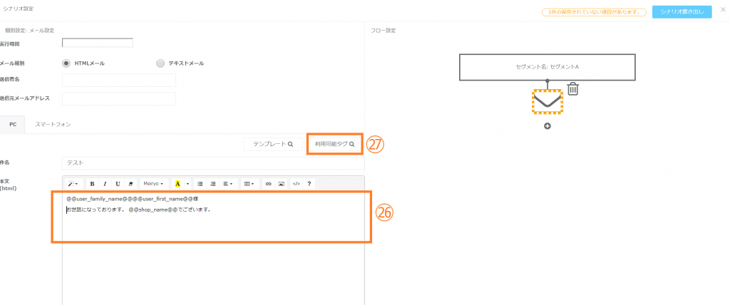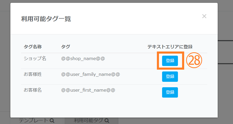 ㉗件名、本文に「ショップ名」「お客様姓」「お客様名」のタグの挿入も可能です。「利用可能タグ」ボタンをクリックします。