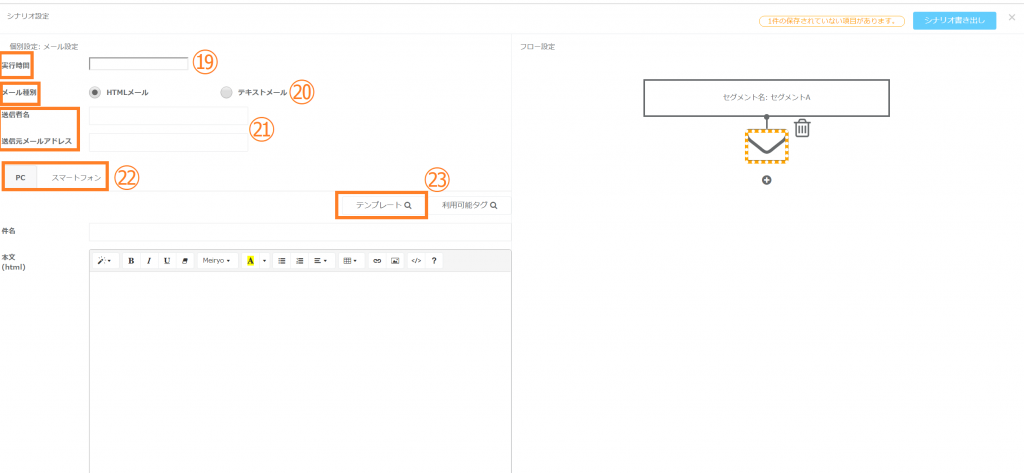 この後、シナリオ設定でメール文面や送信のタイミングなどを登録していきます。