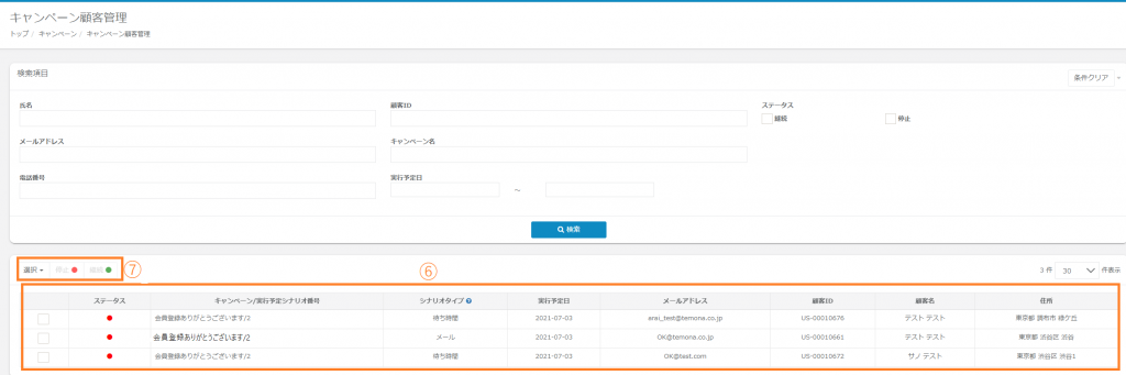 ⑥キャンペーン>キャンペーン顧客管理から、キャンペーンを実施中の顧客が検索できます。