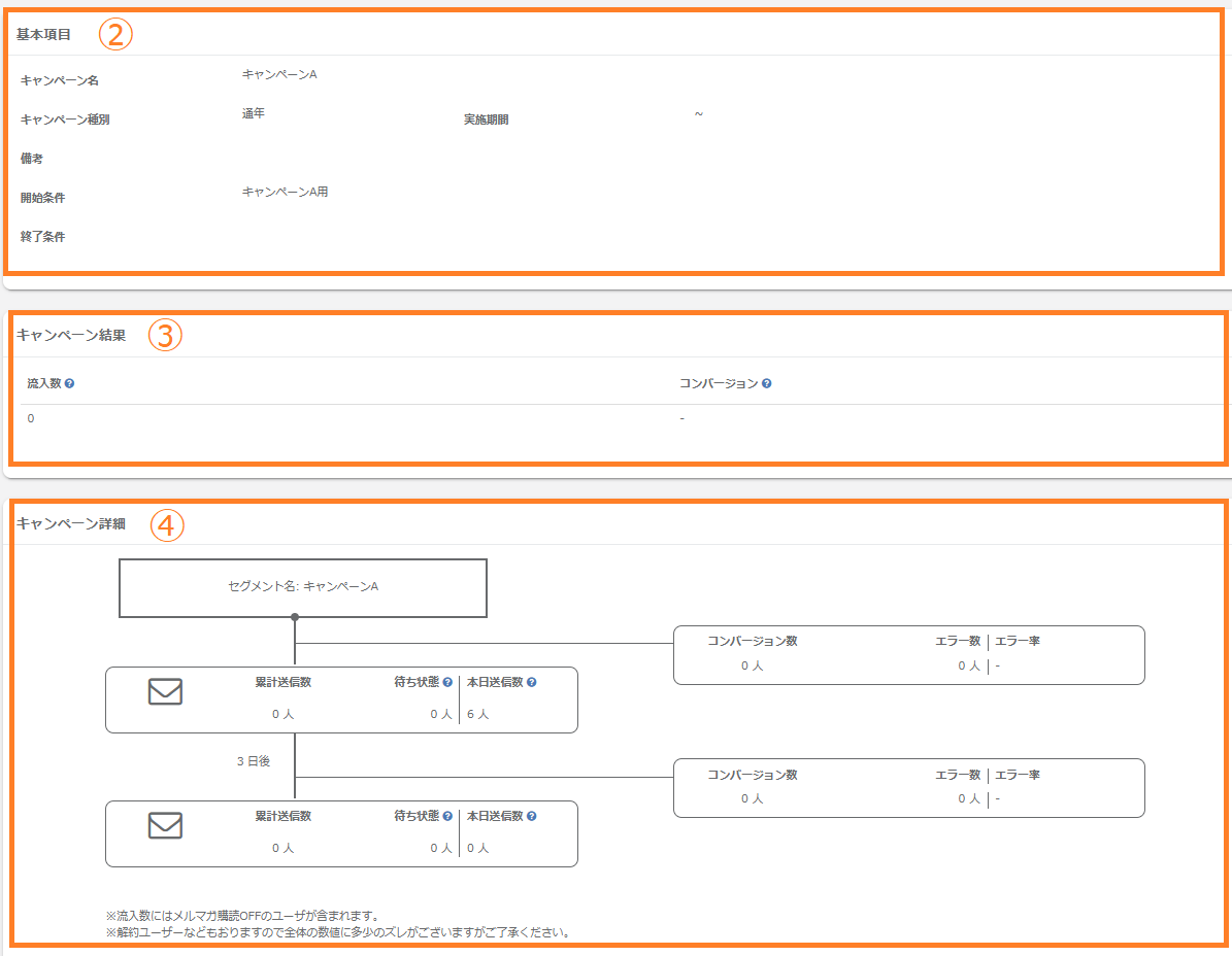 キャンペーン閲覧をしている本日のイベント対象ユーザー数と実行済みユーザー数、ステップメールの「送信数」「到着数/到着率」「エラー数/エラー率」が確認できます。