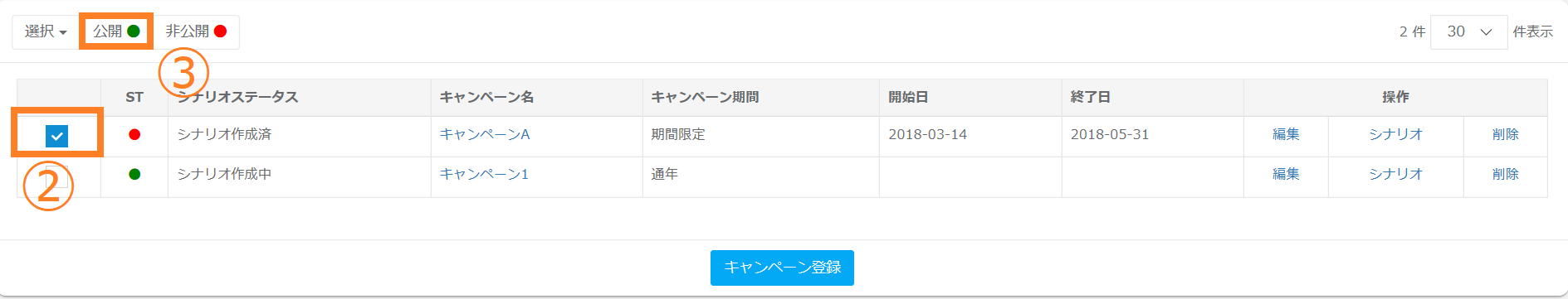 ②こちらの一覧画面からキャンペーンの公開ステータスの変更が可能です。各キャンペーンごとにチェックボックスがございますため、該当のキャンペーンにチェックを入れます。