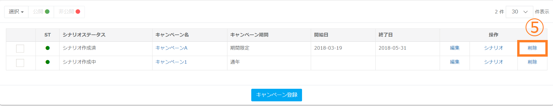 ※該当のキャンペーンが一度でも実行されている場合は削除できません。キャンペーンを止めたい場合はステータスを非公開に変更ください。