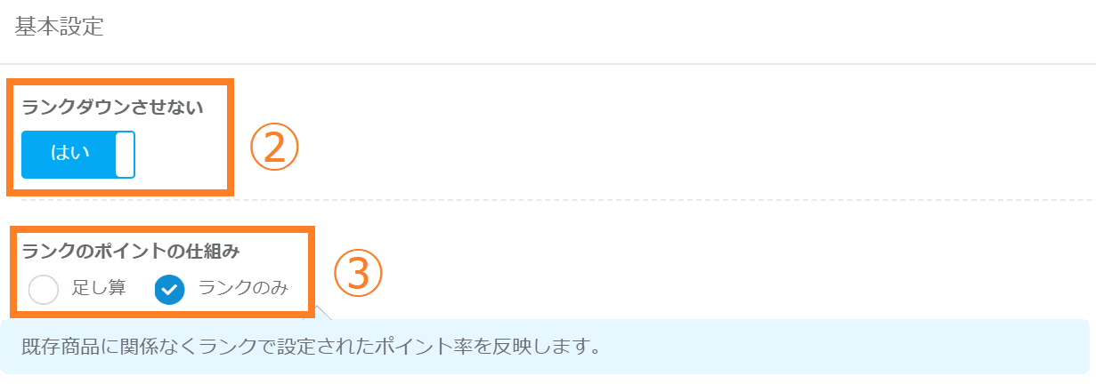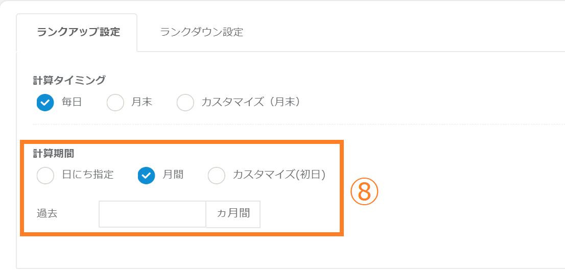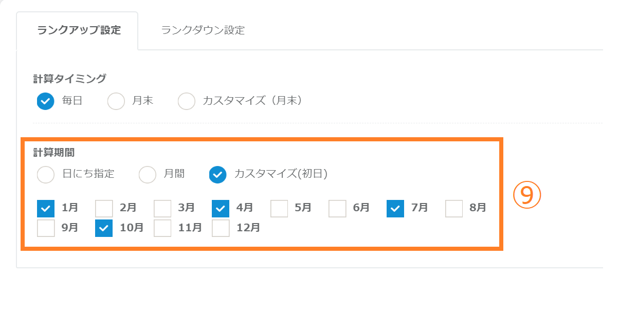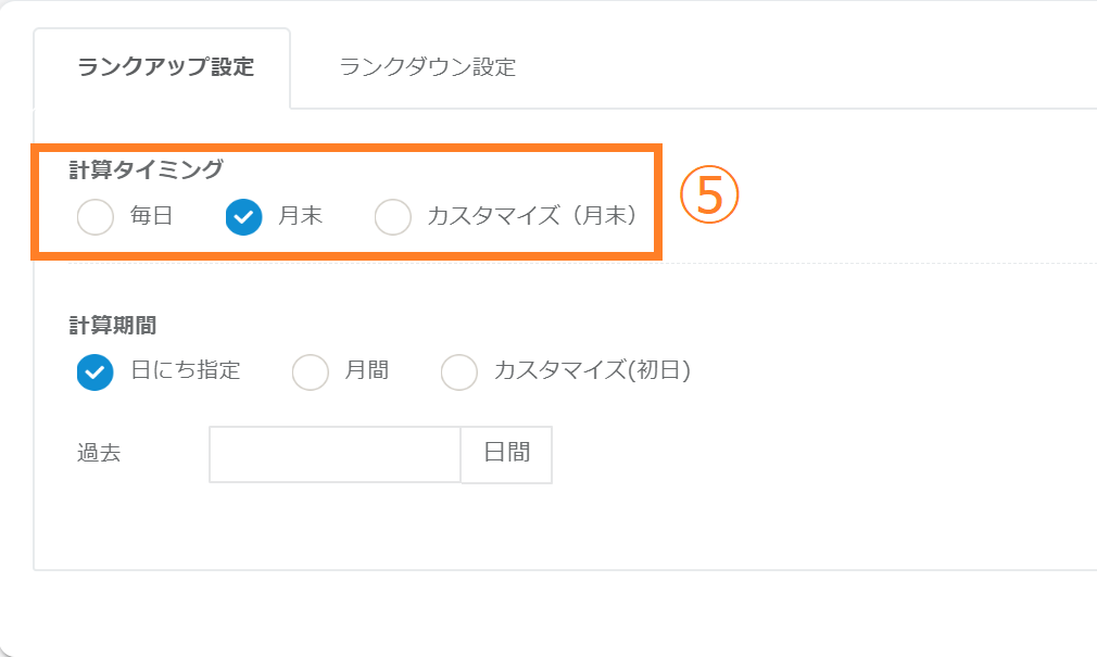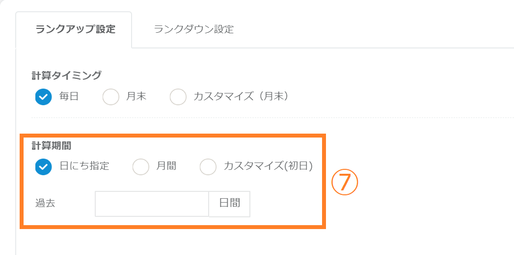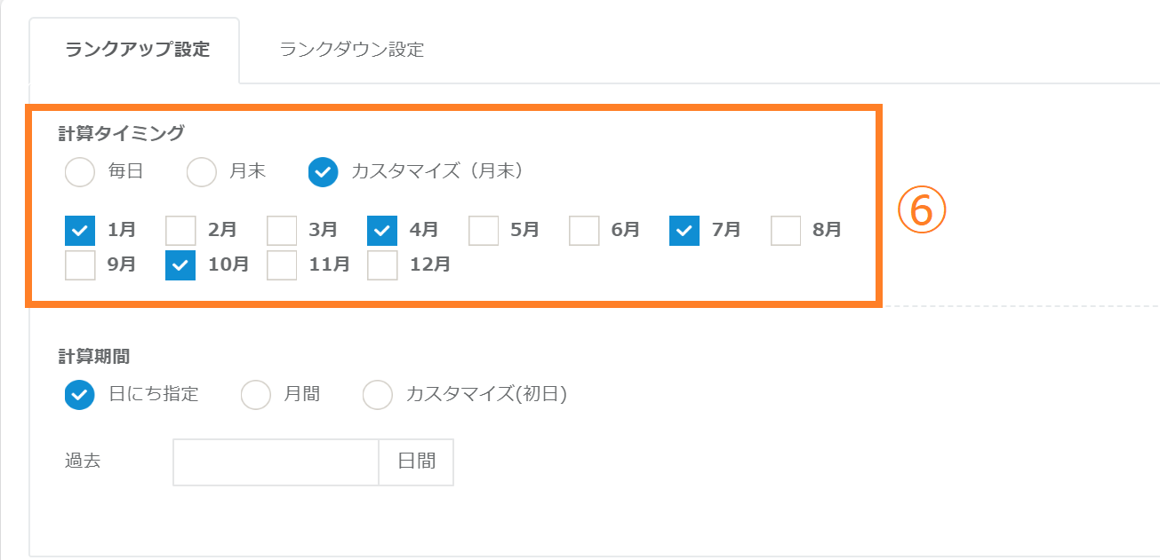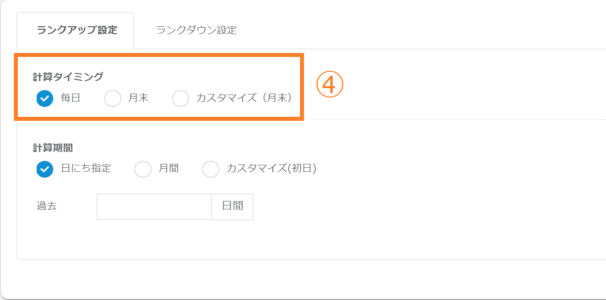 ④ご購入者様のランクアップまたはランクダウンの計算タイミングを設定することができます。