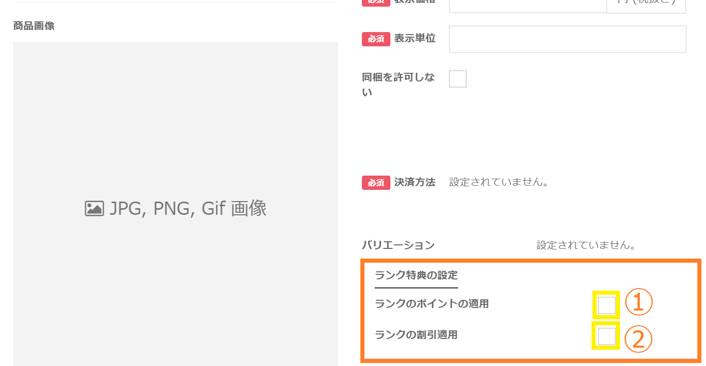 ①会員ランクで設定したランク別のポイント付与を設定する場合、「ランクのポイントの適用」にチェックを入れます。