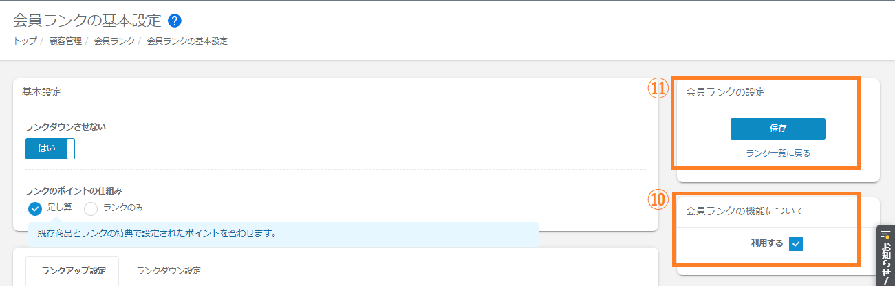 会員ランクのランクダウン設定やランクの計測のタイミングなどの基本設定を行います。