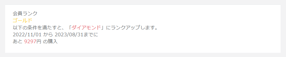 以下のようにランクアップに必要な購入回数や購入金額がマイアカウント画面に表示されます。