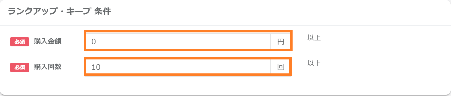 会員のランクアップまたは最高ランクになった場合のキープ条件を、購入金額と購入回数で設定できます。