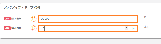 ⑬会員ランクの基本設定にて設定した「計算期間」内での最低購入回数を設定します。