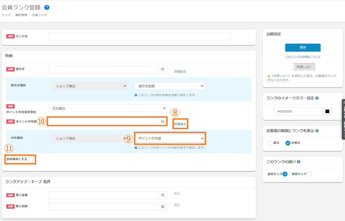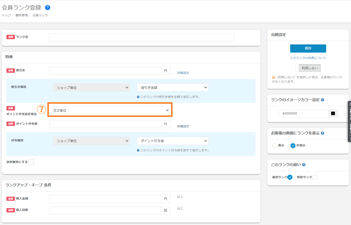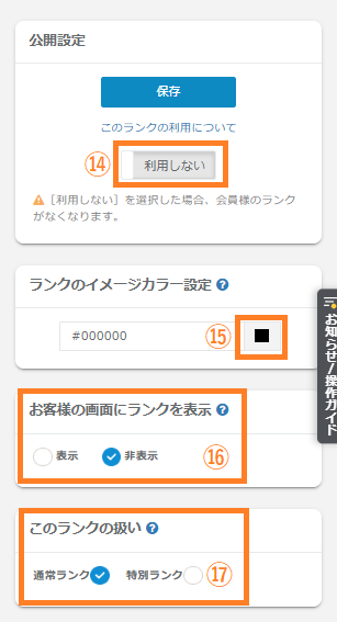 ⑭新規作成または編集した会員ランクを利用するかこちらで設定できます。