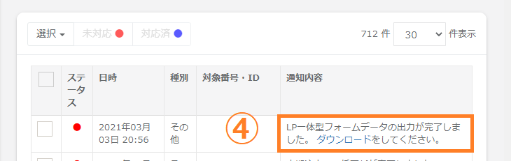 ①検索で表示された、LP一体型フォームの各項目を出力することが可能です。