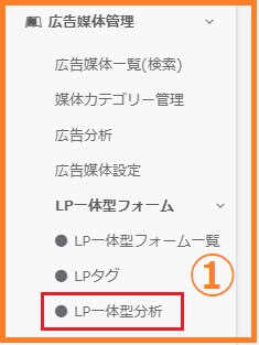 ①画面左のメニューバーより > 【広告媒体管理】 > 【LP一体型フォーム】 > 【LP一体型分析】をクリックします。