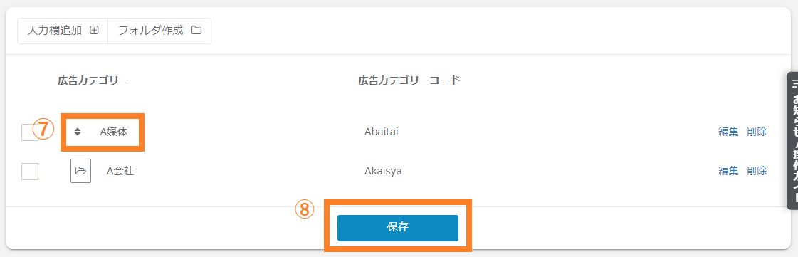 ⑦各広告カテゴリーの左側に矢印のボックスがありますのでドラッグアンドドロップをしてフォルダ内に移動させてください。