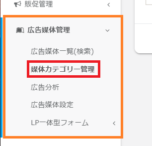 画面左のメニューバーより >【広告媒体管理】>【媒体カテゴリー管理】をクリックしてください。