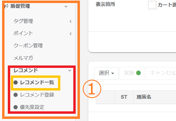 ①画面左のメニューバーより > 【販促管理】 > 【レコメンド】 > 【レコメンド一覧】をクリックしてください。