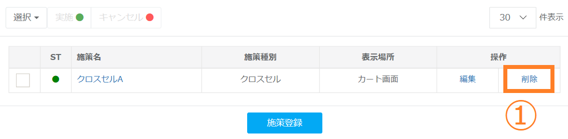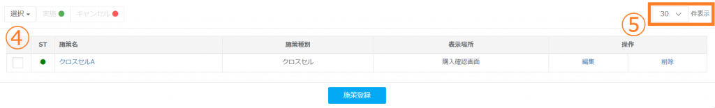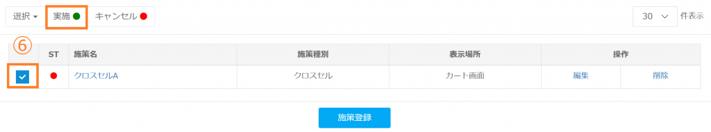 ⑥検索一覧ではレコメンドのステータスを変更することができます。「ST」の項目が赤の丸ならばキャンセル、緑の丸ならば実施の状態となります。施策名のボックスにチェックを入れていただき、必要に応じてステータスを変更してください。