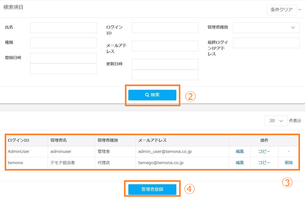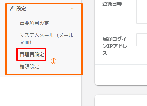 管理者設定では管理画面にログイン出来るユーザーアカウントの追加と削除等の編集を行います。