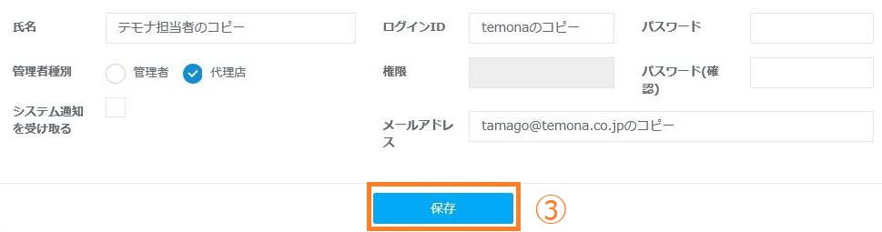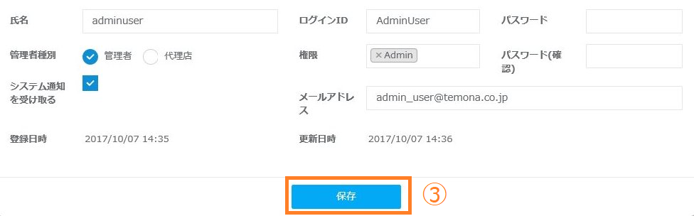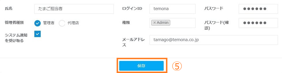 ⑤各管理者情報を入力し「保存」ボタンをクリックします。