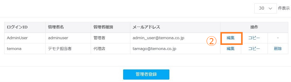 ②編集を行いたいユーザーアカウントの編集をクリックします。