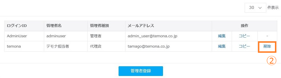 ※「Admin」権限が付与されている管理者は削除ができませんので、権限を変更したうえで削除してください。