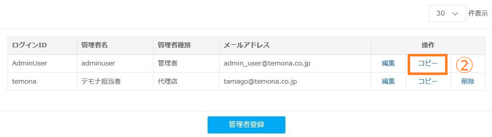 ②コピーを行いたいユーザーアカウントのコピーボタンをクリックします。