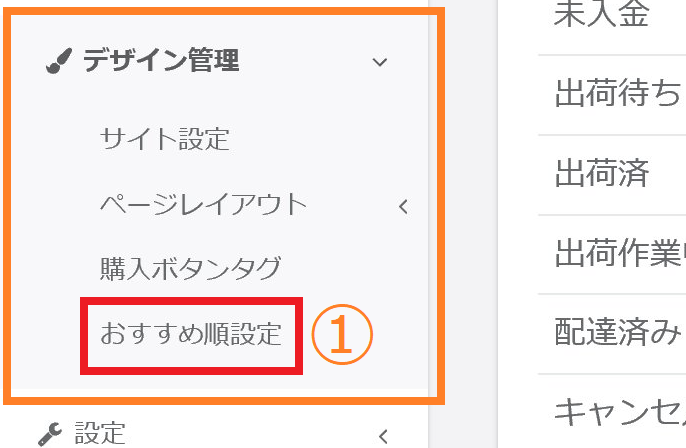 ①画面左のメニューバーより > 【デザイン管理】 > 【おすすめ順設定】をクリックしてください。