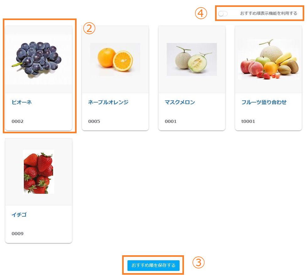 ④「おすすめ順表示機能を利用する」にチェックをしていただくと商品一覧画面へ表示されます。
