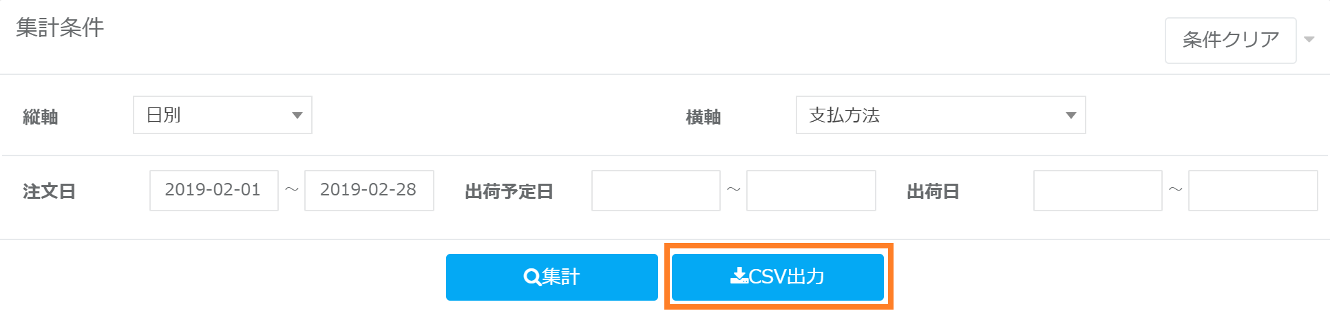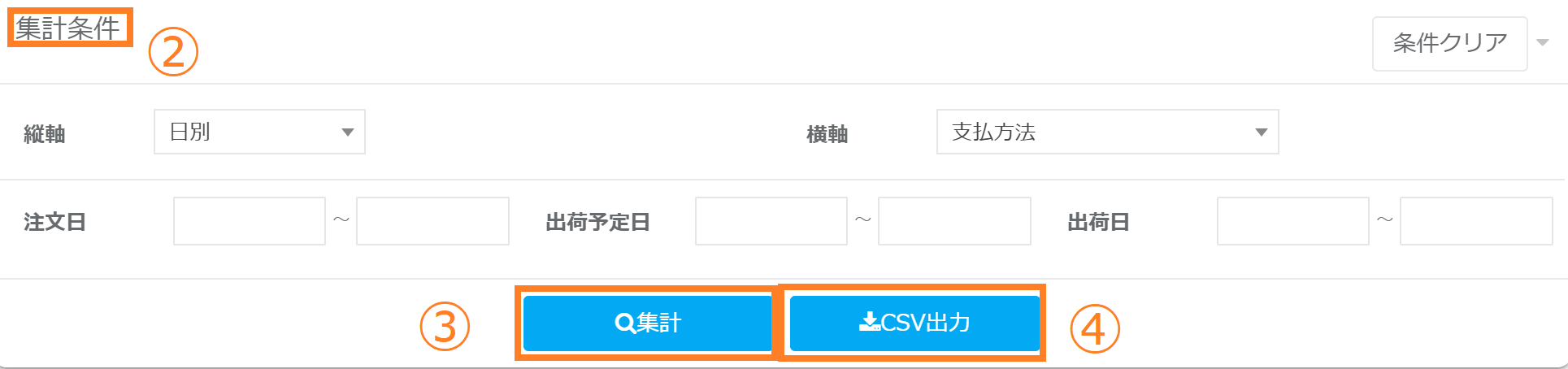 ②CSVとして集計結果を出力する場合は、集計条件を指定して「CSV出力」をクリックします。