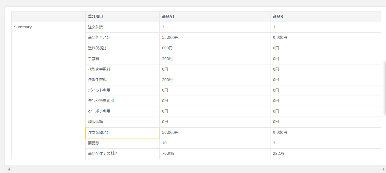 - 商品代金合計:注文商品の商品コードごとに紐づく商品金額の合計