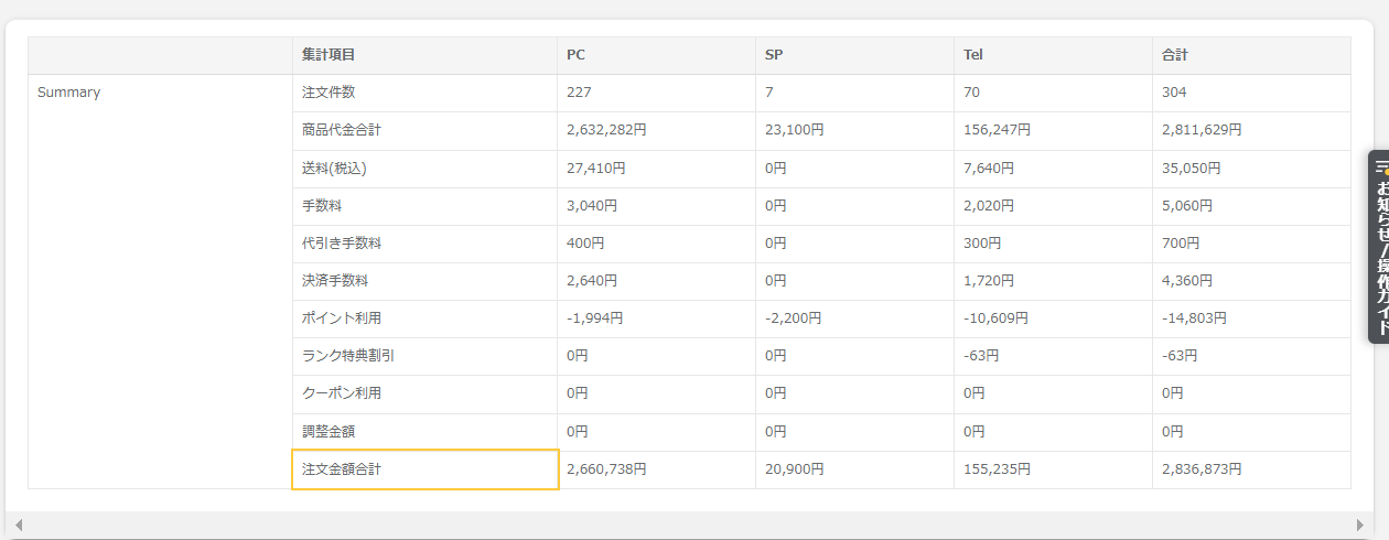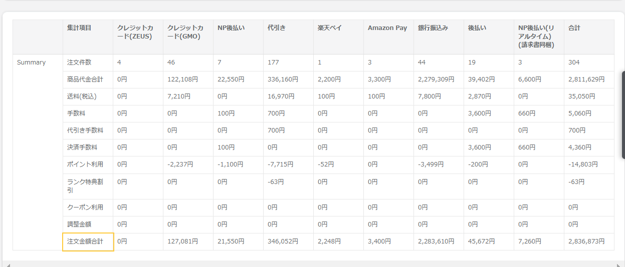 注文金額にて計算が行われたものが「注文金額合計」となります。