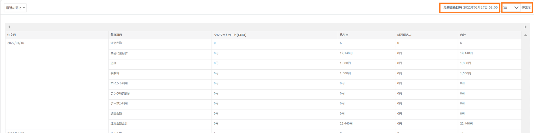 | 横軸 | 売上を集計するにあたっての、横軸を「支払方法」「受注経路」「単品商品」「セット商品」「定期コース・頒布会コース」から指定いただけます。 | 支払方法 |
