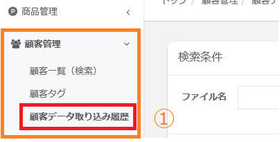 ①画面左のメニューバーより > 【顧客管理】 > 【顧客データ取り込み履歴】をクリックします。