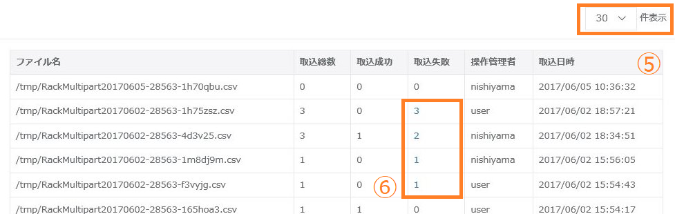 ⑥「取込失敗」の件数を確認します。0件の場合は全て正しく取り込まれています。それ以外の場合は、正しく取り込まれていませんので、数字のリンクをクリックします。