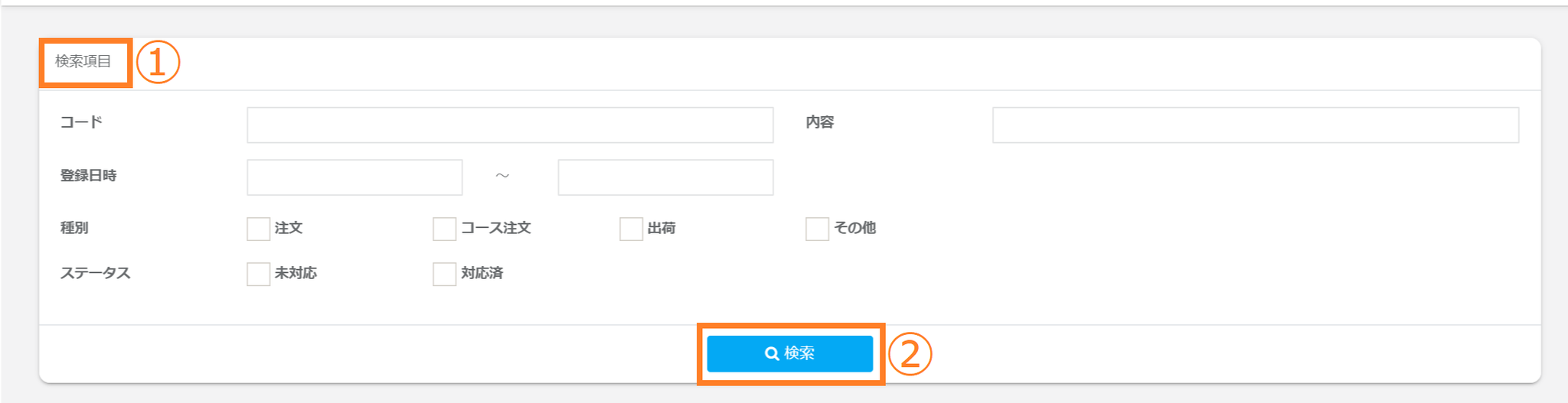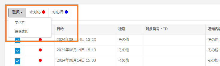 | ステータス | 通知に管理者様が対応完了しているか、未対応かを選択します。 通知ログ一覧の「ステータス」の項目に該当します。 | |