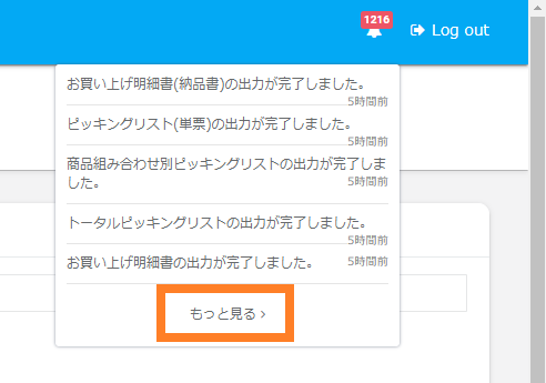 ②ベルマークをクリックいただくと最新の通知5件分が表示されます。それ以上を確認する場合は「もっと見る」をクリックします。
