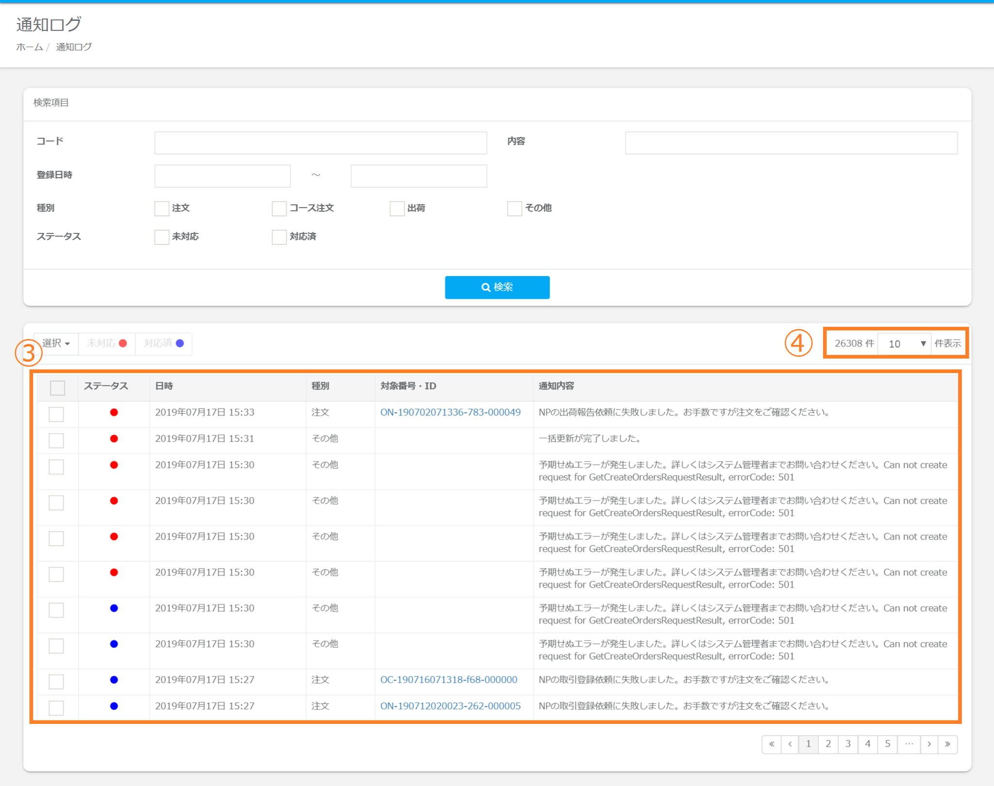 ※通知ログ一覧の「対象番号・ID」の項目に表示されている番号をクリックすると各画面へ遷移できます。