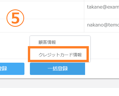 管理画面の【顧客管理】>【顧客一覧(検索】よりページ下部の「一括登録」ボタンをクリックします。登録の種類が2種類表示されるため、「クレジットカード情報」を選択します。