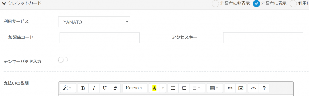 | クロネコwebコレクト | 利用可否 | クレジットカードの利用可否の指定となります。 消費者に非表示:管理画面のみ利用できます。 消費者に表示:管理画面、オンライン画面で利用できます。 利用しない:クレジットカードを利用しません。 |
