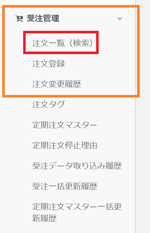 ①画面左のメニューバーより > 【注文管理】 > 【注文一覧(検索)】をクリックしてください。
