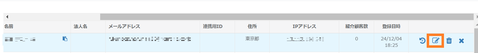 ②クレジットカード情報を登録したい顧客を検索いただき、右側の空欄にカーソルを合わせ、「編集」ボタンをクリックしてください。